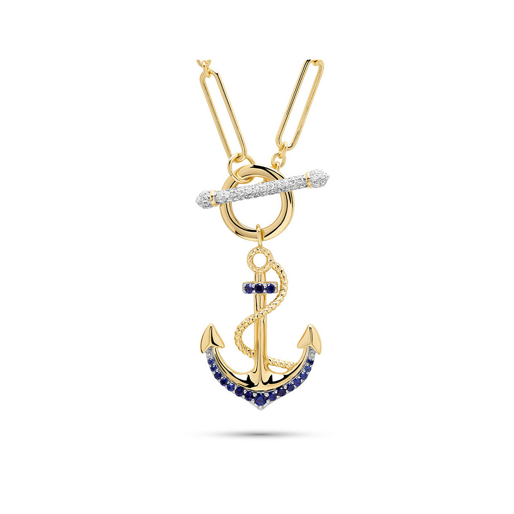 14kt Gold Lab Sapphire and Diamond Anchor Necklace