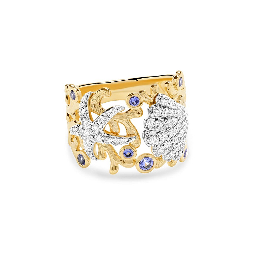 14kt Gold Lab Sapphire and Diamond Shell/Star Ring
