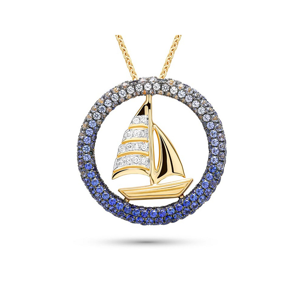14kt Gold Lab Sapphire Diamond Sail Boat Necklace