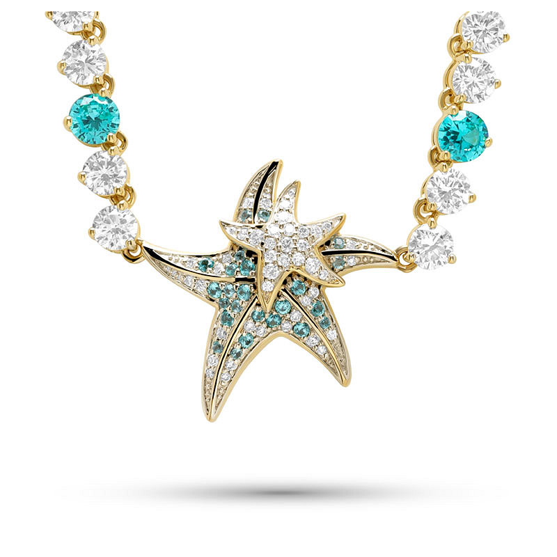 14kt Gold Lab Pariba Sapphire and Diamond Starfish Necklace