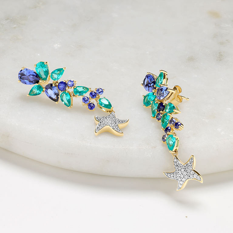 14kt Gold Lab Pariba Sapphire and Diamond Starfish Earrings