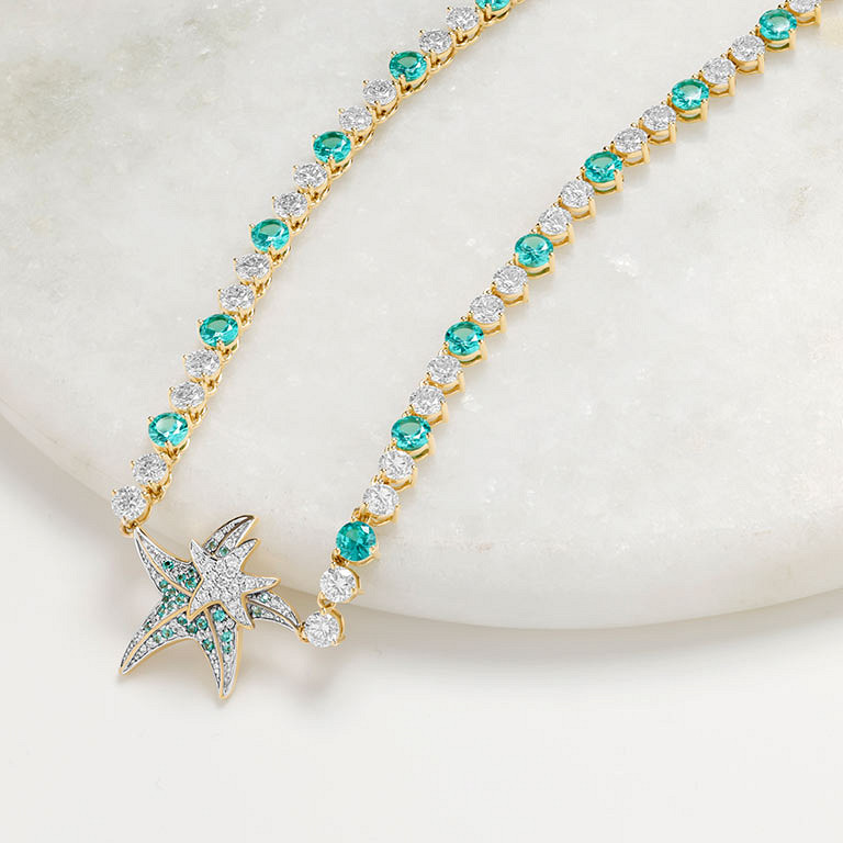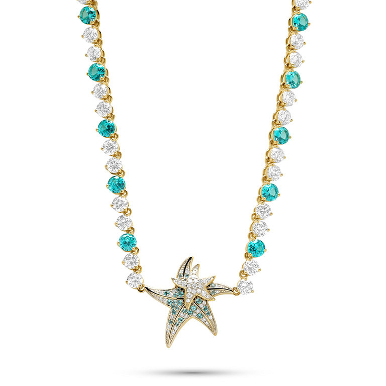 14kt Gold Lab Pariba Sapphire and Diamond Starfish Necklace