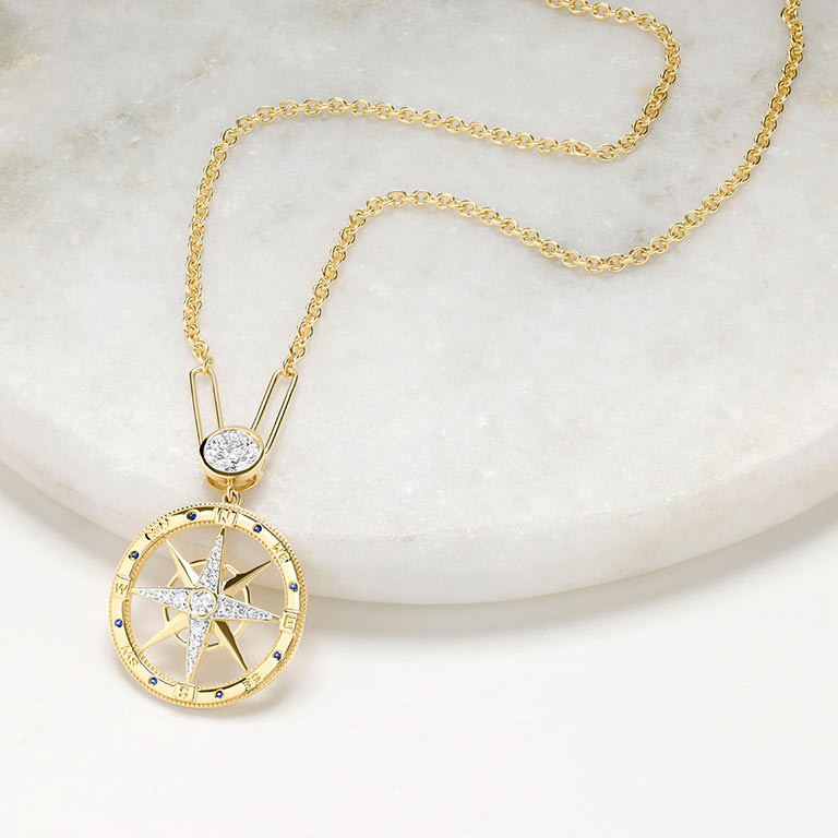 14kt Gold Lab Sapphire and Diamond Compass Necklace
