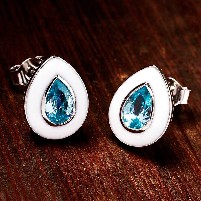 Sterling Silver Aqua CZ with white Enamel Earrings