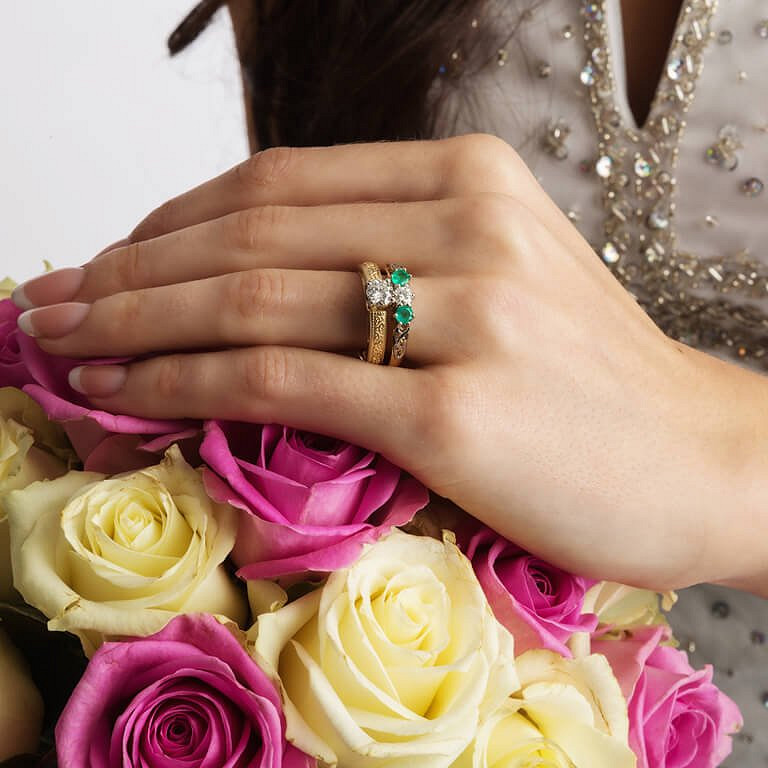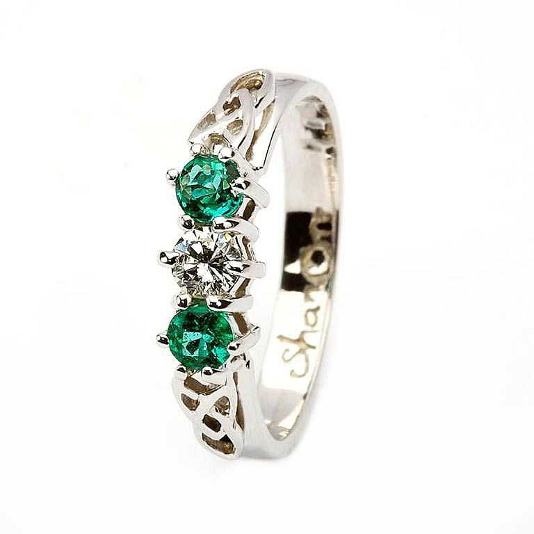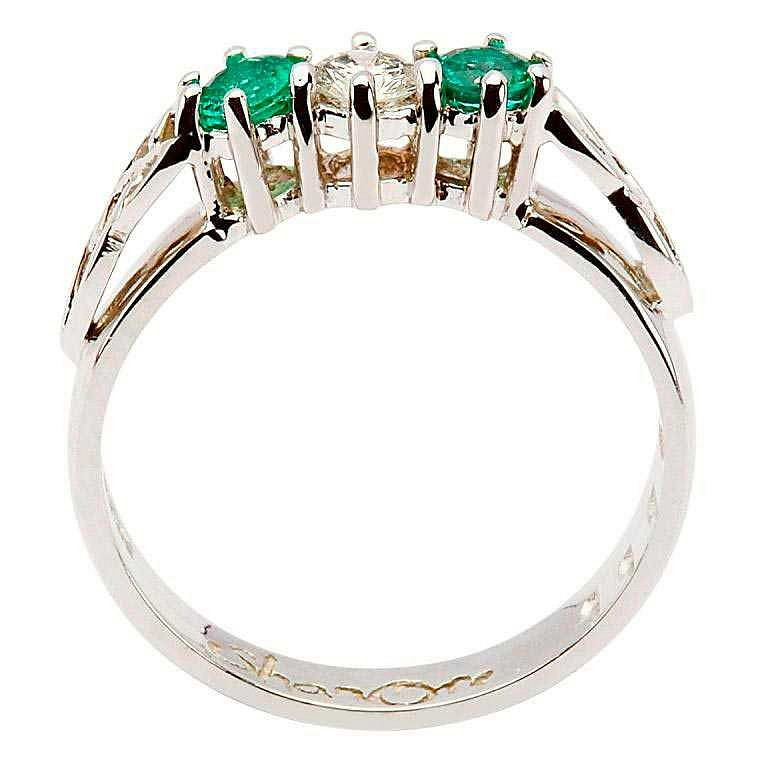 Emerald and diamond celtic ring 14k white gold 3 stone