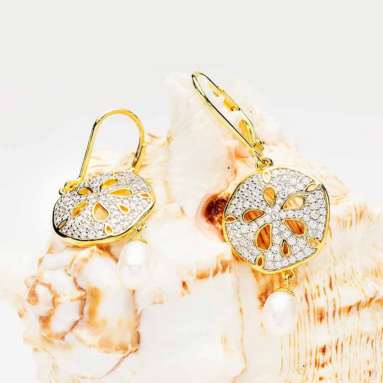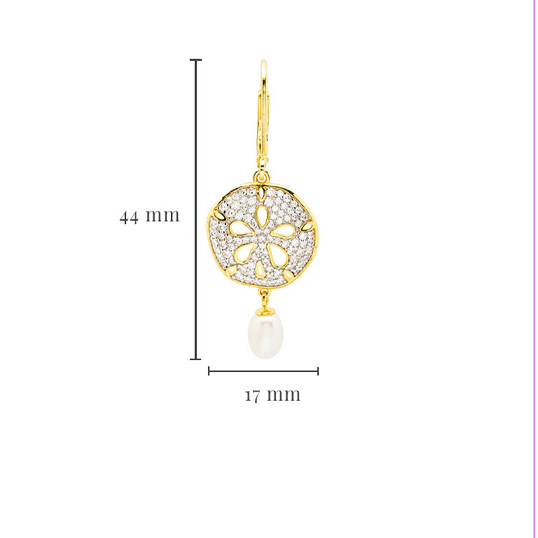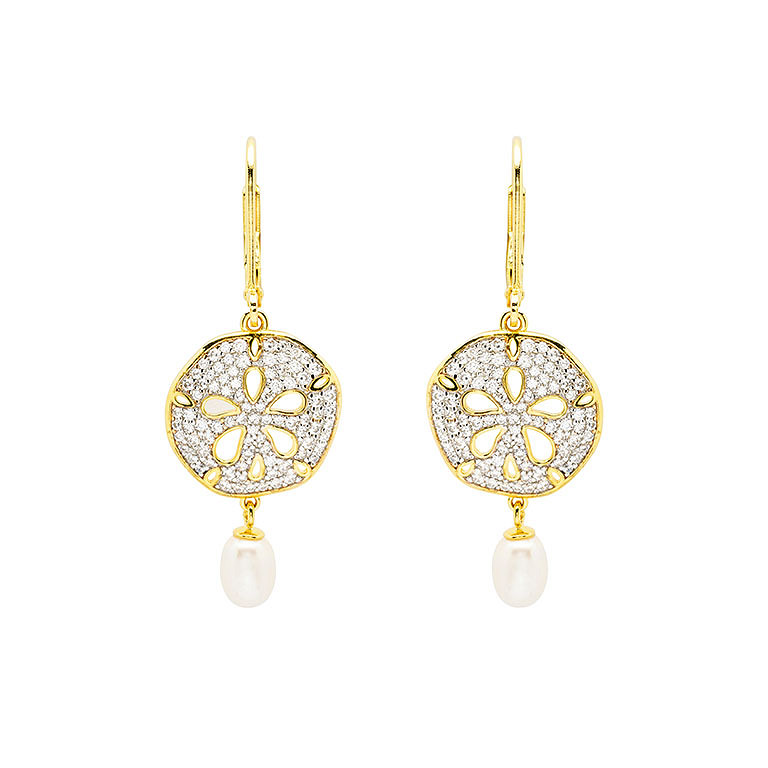 14KT Gold Vermeil CZ / Pearl Sand Dollar Drop Earrings