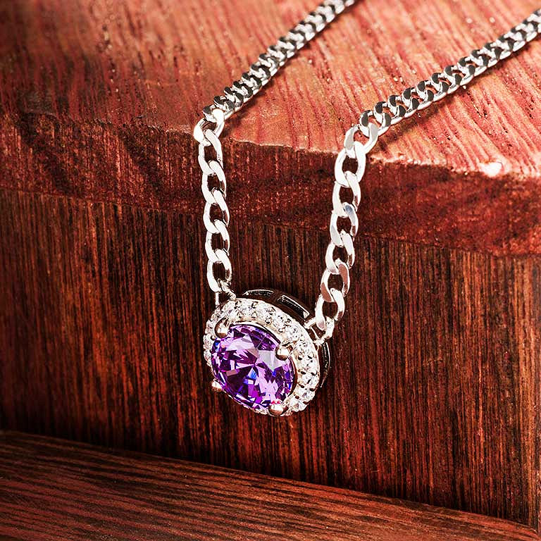 Sterling Silver Amythest CZ Halo Necklace