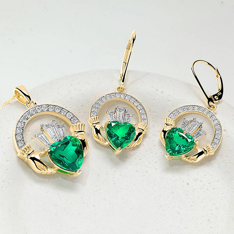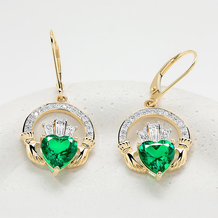 14kt Gold Lab emerald and Diamond Claddagh Earrings