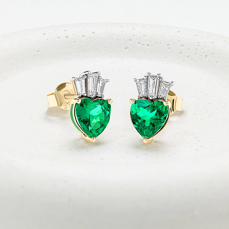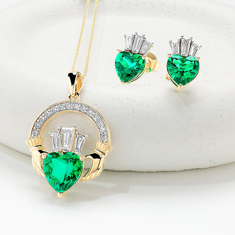 14kt Gold Lab emerald and Diamond Claddagh Earrings