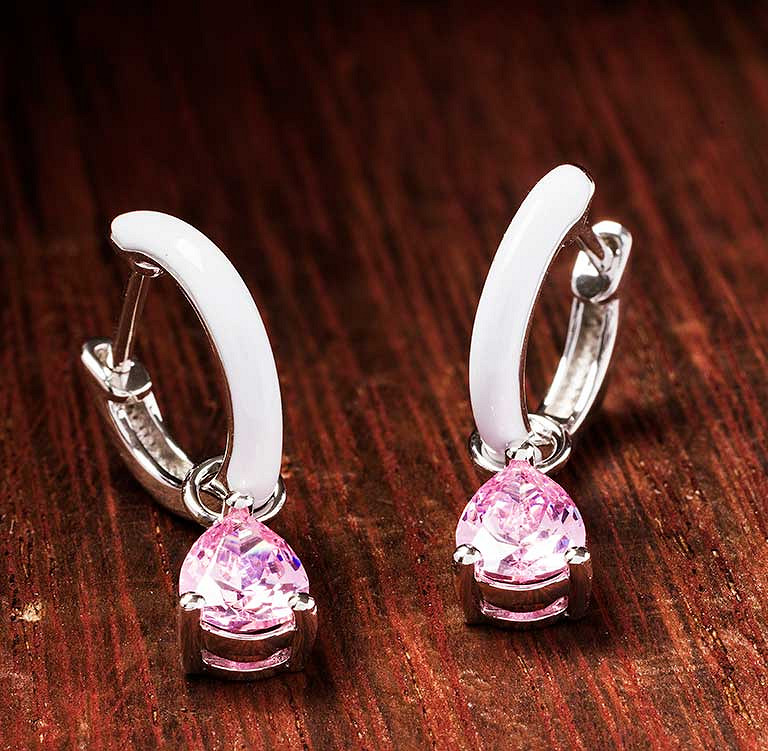 Sterling Silver Pink CZ with White Enamel Drop Earrings