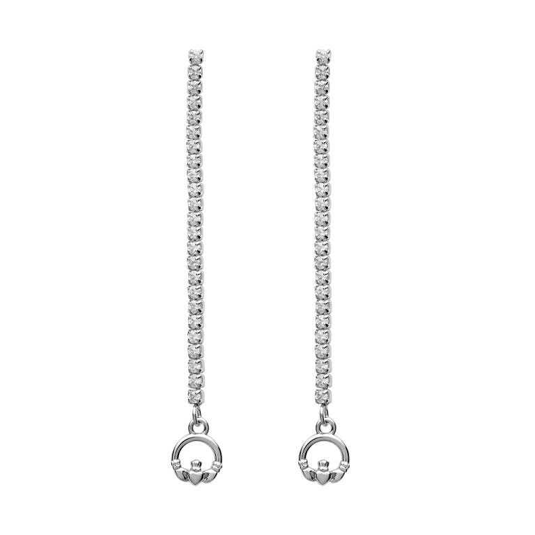 Sterling Silver CZ Set Long Drop Claddagh Earrings