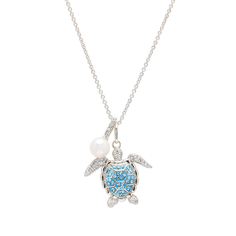 Sterling Silver Aqua Crystal/Pearl Turtle Necklace