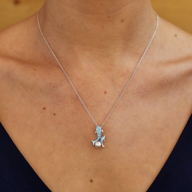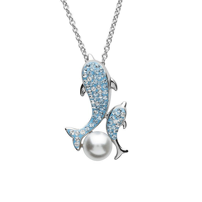 Sterling Silver Aqua SW Crystal and Pearl Dolphin Necklace