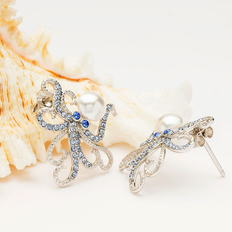 Sterling Silver Pearl and Crystal Octopus Earrings