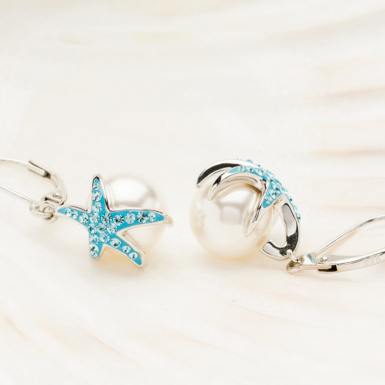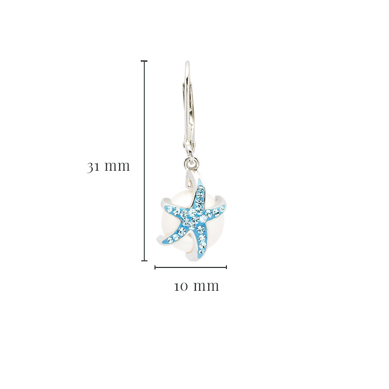 Sterling Silver Pearl / Aqua Crystal Starfish Earrings