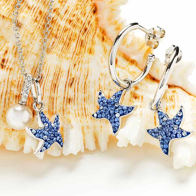 Sterling Silver Saph Aqua Crystal Pearl Starfish Necklace